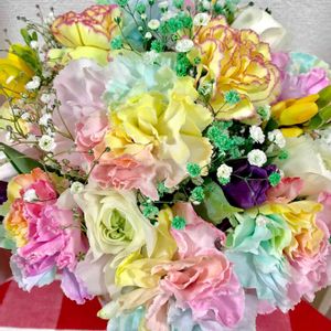 ラウンドブーケ お花があるって、 気分を、幸せにしてくれます。 カーネーション ラナンキュラス チューリップ カスミソウ フリージア
