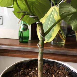 リビングの窓辺にいる ウンベラータ あまり伸びすぎない様 摘心して三又にし 夏の間、針金でぐいっと枝を曲げてました 右の2本は麻紐で股裂き状態😅 これ以上高さが出過ぎると 葉に日が当たらなくなるからなー 時々こっそりお手入れしたりなんかしますが 普段は基本放置です(笑)