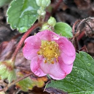 姉の家で撮ったイチゴの花🍓 ピンクで八重咲なんて初めて見ました😊
