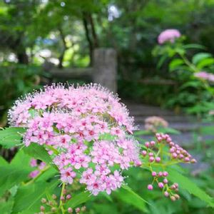青葉の繁った道を通り庭園へ シモツケの小花が弾けるように 咲いていました