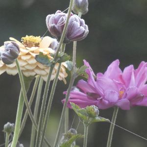 「ジニア&シュウメイギク」 蕾の向こう側で仲良く咲いています。 🏷寄り添った睦曜日の花 🏷モダンな木曜日