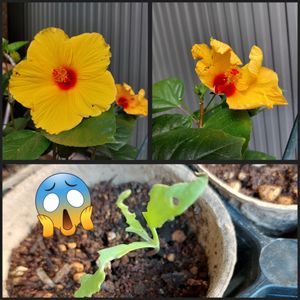 ハイビスカスの花と、キンセンカの苗🌱食べられたわ (|||ー̀ㅁー́)探したら、青虫、モンシロチョウの幼虫に似ていた🐛捕殺の刑です (๑ŏ _ ŏ๑)↷↷