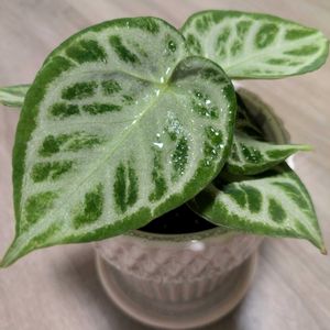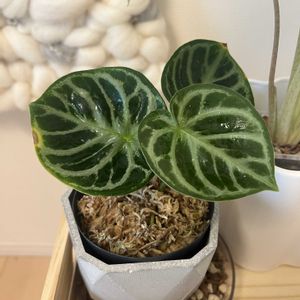 お店で一目惚れしお迎えして2ヶ月 順調に育ってくれて嬉しい🥳 購入した時の名前はアンスリウム ドラヤキ としか記載されてなかったけどシルバー なのかな?? 新しい葉っぱもキラキラで可愛い🤍