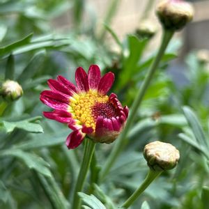おはようございます☀ サントリーフラワーズ ボンザマーガレット🎵 ウチにいる4種類です。 1枚目:ルージュピンク 去年の秋お迎え組の中では1番咲いています😊 2枚目:コスモスピンク 去年の秋お迎え。去年も育ててましたが(夏に枯 れた😭) 今年はお花が遅いようですが蕾はいっぱいですね😃 3枚目:サンライズピンク 去年の秋お迎え。 新色なので初めて育てます。 蕪のボリュームは1番大きいですが花数はまだ少な目。 これからかな〜😄 この前の強風で倒れてしまい、左側がポキポキいってしまいました🙀 4枚目:レモンイエロー 多分夏越し2回してると思います😅 我が家1番のボンちゃん古株。 お花が小さい感じもしますが元気に咲いています😁