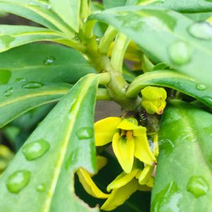 「初めてまして✨」…(๑˃̵ᴗ˂̵)💛 葉の間から可愛い顔をのぞかせて いる、黄花沈丁花です。