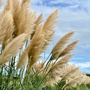風に揺れるゴールドの穂先が美しいパンパスグラス🌾 空を見上げたら季節の移ろいを…(๑˃̵ᴗ˂̵)🍁