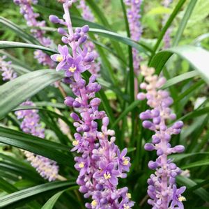 木陰でひっそり咲いていたお花💜 *ヤブラン* 別名・リリオペ、サマームスカリ なるほど❣️春に咲く大好きなムスカリに似てる〜‼︎😍💕オシャレな別名! 花後の黒い実もカワイイ●✨