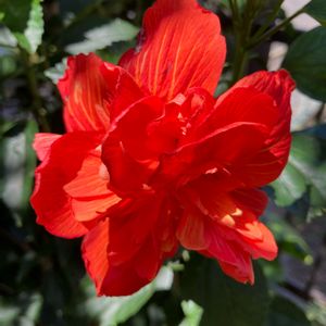 赤色ハイビスカス🌺朝日を浴び✨ 綺麗に咲いていました。✨😊 オレンジ色と赤色ハイビスカス同じ鉢に植えてから、何年かぶりの開花です。✨