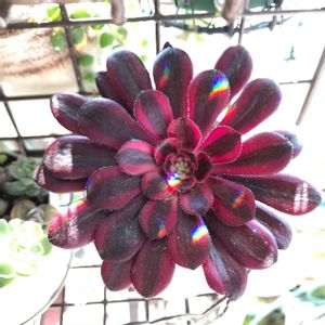 🏷錦の日に参加します😊 アエオニウム黒法師錦さん✨ サンキャッチャーの虹色の光が当たってキラキラ✨