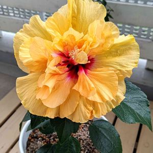 おはようございます☀️ 6月3日投稿の 蕾のハイビスカス 直径15センチの大輪の花が咲きました💗💛☀️(^^)d 大きさにビックリ👀‼️ 花言葉は「輝き」✨✨ 今日も輝いていきましょう