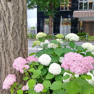 今朝のベランダ☘ アナベルが見頃を迎えて、梅雨空に良い感じです😊 カリブラコア切り戻す前にパチリ♫