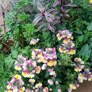 おはようございます☀️ 一昨日ご紹介した ネメシアチョコバナナ🍌 寄せ植えのなかで 咲いてくれてます❣️🍀🤗 バックの🟣のアネモネは蕾が待機中💞💞💞
