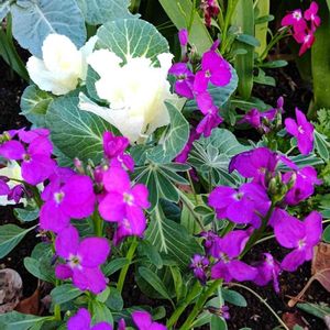 おはようございます☀️ 朝🌄散歩で出会った 一重のストックと葉牡丹の 組み合わせ❣️🍀 ストックも一重と色合いで和を感じます💞💞💞