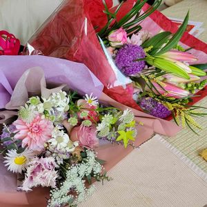 丘の風だより🌱 先日義母のお誕生日に🎂娘2人から色違いの小さな花束にそれぞれメッセージを添えてプレゼント💝 春らしく可愛い感じにしてもらえてみんな満足💕せっかくなので投稿します😅