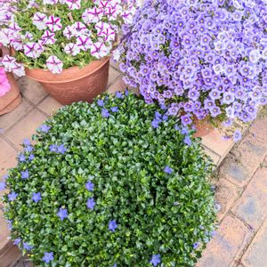 出勤時間にザーザー雨降り しんど☂️ ① カンパニュラ メリーベル 玄関前に避難💦早く花こんもりになれ🎵 ② シレネ ユニフローラ 寄植えの綺麗なグリーンで活躍して 花もたくさん咲いて可愛い💓 前に 初めて寄植えした時は 花が咲くって知らずに使って 咲いた時 あまりにたくさん咲いてきて ビックリしました😅