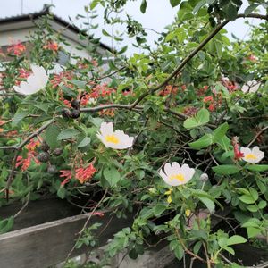 昨日投稿のつるバラ・スパニッシュビューティー。 他にツキヌキニンドウ、ハニーサックル、ルリマツリが 誘引というか勝手に絡んでいる。高い木は姫コブシ。