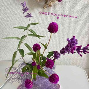 🤗センニチコウ💕 メキシカンセージ💜 今は長野へと向かう電車🚃の中です。 お出掛け前にベランダのお花を✂️して、 何ちゃってアレンジしました😊 この後、ドライにしています💐 帰って来たら、いい感じになってくれているかな〰︎😍 父母をミマモルンジャー 行ってきまーす🤗 今日も笑顔の一日を🎶🍀🤗