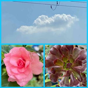 今朝の雲 この雲を縦に見ると、おじいさんに見えます 薔薇咲きインパチェンス 黒法師