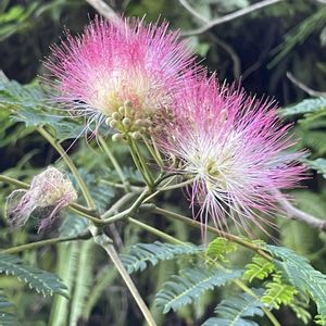 ①②③ ネムノキ 合歓木 マメ科 落葉高木 本州、四国、九州、琉球、朝鮮半島、中国暖帯、および温帯 夜になると葉が合わさって眠るように閉じる為、この名前がある 香美市 6/28 こんにちは ピンク色のは雄蕊のようですね🌸根基は白色です🤍🌸花弁は中程で合着し見当たらない🌸 今の時期、優しいピンク色の花を付け癒してくれるのはネムノキです🌸 山が若葉色から濃い緑色へと変わっている時期に突如優しいピンク色が現れて癒やしてくれます🌸🌳 高木の為、中々写す事が出来ませんでしたが、今日は後ろから大きな声が、「合歓木が咲いちゅう、早う来て〜」どうせ写せないだろうと思ったのですが、せっかく呼んでくれるので引き返すと一生懸命枝を捕まえ、撮りやすいようにしてくれてました🌸🌳😍 いつも小さな花や木を撮ってる時には皆様無関心😅😘 サッサと置いて行かれます💦🌸🌳 🏷 われら樹木探検隊に参加します