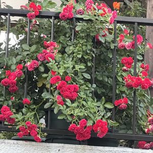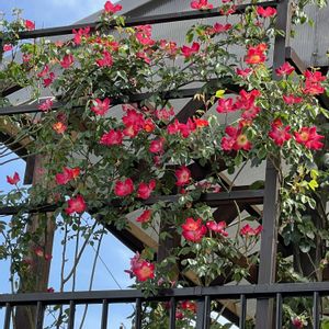 もう終わりかけなんですが、モンジャルダンエマメゾン(一期咲) 咲き始めは遅いのですが、他の四季咲き、返り咲きのがもう最初のはほとんど散っているのですが次々に咲いて長い間楽しんでいます(一期咲が残念😢です) ①子株ですが現在も咲いています 3枝ぐらい集まって房咲きのようになっています(今年は多くて2輪ぐらいの房しかなりませんでした) 終わりかけなので中輪ぐらいの花径です 5月29日撮影 ②元株5月18日撮影 現在(6月3日)もこんな感じです 花は変わっていますが ③元株の株元 株元から咲かせられました 5月20日撮影 ④イルミナーレと 5月17日撮影 ⑤開きかけはこんな感じ 5月20日撮影 ステイが長く、中大輪です