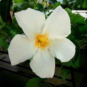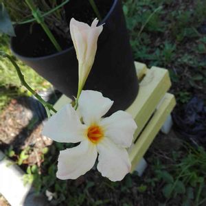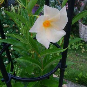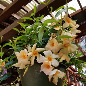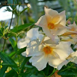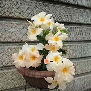 サンパラソル アプリコット キョウチクトウ科マンデビラ属 夕陽を背に受けて、透けた影を悩ましげに映す君が好きで… 1日の出来事を微笑んでくれるから……………(。-_-。) いつもありがとう…そう言えるあの日の想いでに〜 −−−−−−−−− 最近??ずーっと??剪定と伐採に出ています。 おかげさまで気を失ったかのように朝を迎えています_| ̄|○ 夢で逢えたらイイのにネ(*˘︶˘*).。.:*♡
