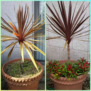 今日のお花の💚コルジリネ💚 ①通勤途中のビル前のコルジリネ。 同じ場所の同じコルジリネですが、右側は観賞用トウガラシとの寄せ植えになってた時期もありました✋ ②お出かけ先のコルジリネ ③わが家の小さなコルジリネ 赤と緑のストライプが綺麗です🥰💕