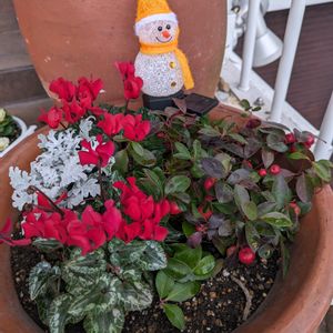 ①〜④レストラン前に飾られていた❤️シクラメン❤️💚チェッカーベリー💚🤍シロタエギク🤍の寄植え、雪だるま⛄も可愛らしいです🤗💕