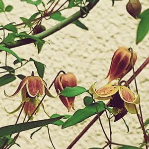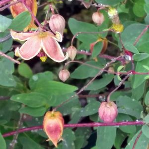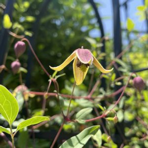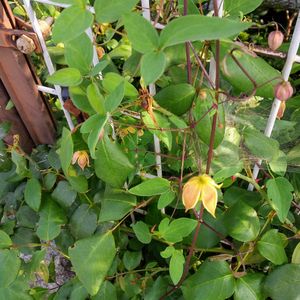 おはようございます😄 今日も晴れて陽射しが強くなってきました🌞 クレマチス マイエンジェル** 小さなベル咲き🔔可愛い〰️💞 《品種記録》 タングチカ系 ベルの形で、赤紫に黄色の縁どり。 花弁の内側は橙色で四季咲き性 強剪定。 シックな雰囲気のある可愛らしい ・草丈;2〜3m(つる性)