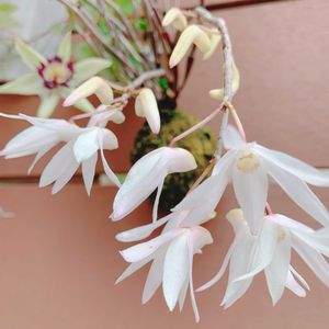 ①昨年お迎えした苔玉仕立てのセッコクが咲きました🤍✨️ 葉もろくになく、枯れたような茎からこんなに可憐なお花が咲くなんて😍 ②5年目のナゴラン 去年初めて咲き、今年も開花。 香りがある可愛いお花︎💕︎ ③名前はわからないけど、お気に入りの胡蝶蘭😊 ④⑤ミディ胡蝶蘭、大輪の白もゆっくり次々咲いています。蘭は長くお花を楽しめるから好き🥰