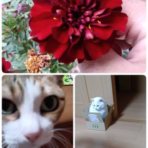 マリーゴールドが鮮やかな赤に。 箱があったら入りたい猫。 それを冷めた目で見てた猫。