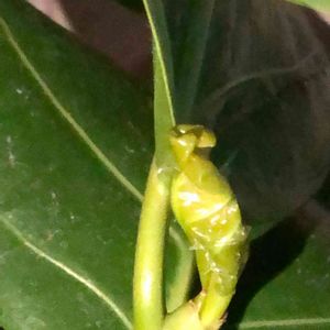 シーグレープ💕 暗い部屋でライトを当てての撮影(笑) 何これ?? みたいな(-_-;) 思った以上に新芽の生長が早くて 芽キャベツみたい❗️じゃなくて まるでモンシロチョウのサナギみたいな新芽になっちゃっています…。 破けず綺麗に開くかな?