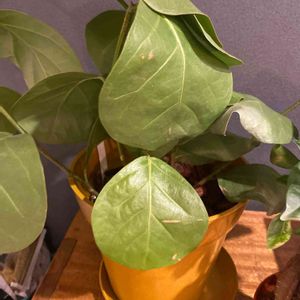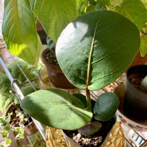 革のような質感、丸い大きな濃い葉の色に惹かれ、ネットにて購入。存在感あります! カシワバゴムと迷いましたが、くねくねとした奔放な伸び方を見てみたくて、シーグレープをお迎えしました。