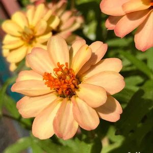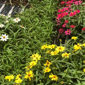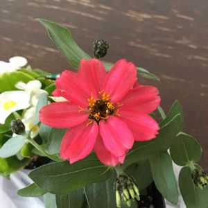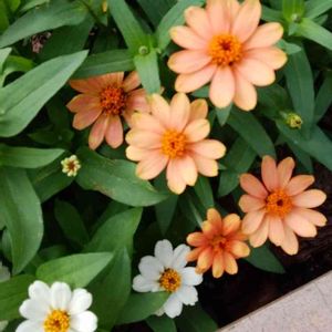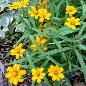 今日のお花より 🌼ホソバヒャクニチソウ(細葉百日草) キク科 ヒャクニチソウ属 茎はたくさん枝分かれし、茎や葉は短い毛でざらざらしています 花冠は明るいオレンジか黄色ですが中には白か、その他さまざまないろがあるそうです 今日のお花がジニアと言う事で我が家の寄せ植えのお花です