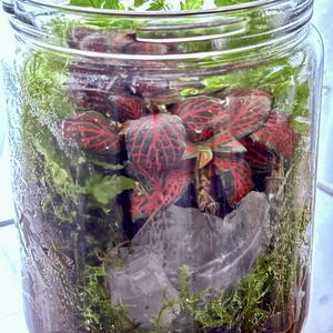 my first 💚テラリウム💚 完成🎶 フィットニア•レッド、シダ、苔、かちわり水晶 。 今日も有難う御座いました💫