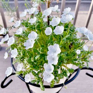 ライスフラワーの足元に色々寄せ植えしています。他のリーフ類はまだまだ成長途中。1番立派なネモフィラが早々開花しました。