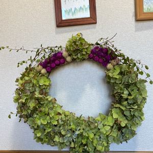 こんにちは🌞 今日はツルをとって来てリースの枠を作り 千日紅と紫陽花とワイヤープランツで リースを作ってみました😄😄😄 手作りのリースで大きくなったけど まぁいいか😅🤭🤭
