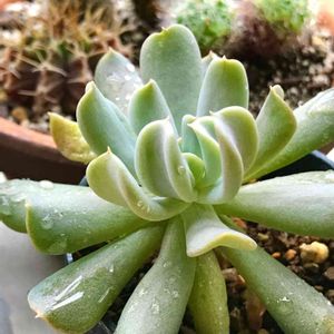 とみ乃チャンから7月5日『Ucchi~部屋でスパルタに育てて欲しい』と託された、110円の値段札付いてた手前のトップシータービー🤣 相撲部屋かっ‼️て突っ込みいれながらも本当に真夏も西日ガンガンに育てたよ٩(ˊᗜˋ*)و 昨日、そーだ( ゚艸゚;) トップシーちゃんどうなってるかな~と久しぶりに確認❣️ 斑が綺麗に入ってる⁉️ 赤い多肉も良いけど、グリーンが映える季節かも(๑˃̵ᴗ˂̵๑)♡