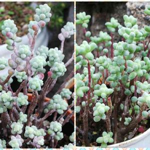 セダム属 ブレビフォリウムたち🌱 多肉4年生に進級したので、ちょっとは誰かの参考になるかも!?な投稿をしよう🎶(と思っていてもすぐに忘れて親バカ投稿に戻ると思うけど😂) 多肉ラボ©お題②「冬に元気な子」 乙女心と恋心もそうでしたけど、実はパープルヘイズとダシフィルム、ブレビフォリウムの違いが最初の頃はややこしかったんです😅今となっては「なんでややこしいと思ってたんだろ」っていう感じなんですけどね🤭ということで我が家の子たちを並べてみました🎵 この子たちは皆んな冬にバリバリ元気ですよ😊👍 左側がアップ、右側が草姿。 上から 「パープルヘイズ」 Sedum dasyphyllum var.granduliferum ダシフィルムの変種。ダシの中では割りと葉っぱが大きめで無毛。葉序が互生でよく見るとつぶつぶ模様があります。うちでは放っておいても時期になるとモコモコしてきます✨ 「ダシフィルム」 Sedum dasyphyllum var.dasyphyllum 変種じゃないダシフィルム。パープルヘイズより葉っぱが小さくて微毛。葉序が対生です。うちの子はまだミドリんですけど、この子も紫になります。“ブレビフォリウム”という間違った名札で出回ってますよね💦 「ブレビフォリウム」 Sedum brevifolium ほんとのブレビフォリウム。これはダシではないんで見た目は全然違いますね~。なのに名札は”木立性ブレビフォリウム“で上の間違いブレビと区別されて出回ってます😂 この子らの区別がややこしかったのは名札のせいでした。ちゃんとした名札に統一したら、めっちゃわかりやすいじゃん(笑)だって見た目はそれぞれ違うんだから🤭🎶 「たっちんのパープルヘイズ」「たっちんのブレビフォリウム」「たっちんの木立性ブレビフォリウム」タブをタップでこの子たちの生長記録のみどりのまとめが簡単に見れます😊🎵