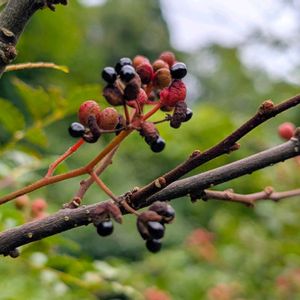 こんにちは😉サンショウの実が赤くなって黒い実にかわりはじめていますがキジバトが来て様子をみています😁