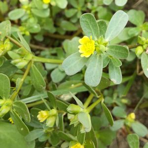 小さな小さな黄色い花が……(✯ᴗ✯)❋❆❀ 午前中の短い時間だけ咲かせてすげにしぼんでしまいます しぼまないうちに📱❇️ᕙ(@°▽°@)ᕗ スベリヒユ 花言葉 「無 邪 気」 葉・花は肉質で 世界の色々なところで食べられているそうです 🌿🌱食べてみよう🥗🥢 (◍•ᴗ•◍)💕