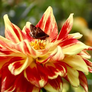 ダリア "Ballego's Glory" (キク科) マホガニーレッドの花びらが金色で縁取られているのが特徴。赤とオレンジ色の花弁が見られるます。 非常に魅力的😍 イチモンジセセリちゃんが その魅力に引き寄せられてやって来ました🤣 町田ダリア園にて撮影📷