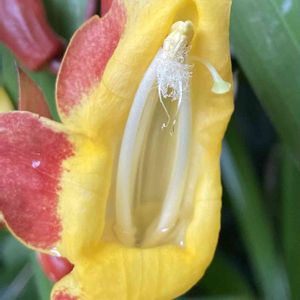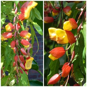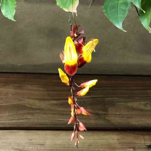 伊豆味ベゴニア園2 マイソルヤハズカズラ 学 名 Thunbergia mysorensis 科 属 キツネノマゴ科ツンベルギア属 つる性常緑低木/多年草 原 産 インド南部 種小名のmysorensisはインド南部の都市マイソール(Mysore)に由来する。花がスリッパに似ることから、英名でLady's slipper vineと呼ばれる。茎は基部が木質化する。葉は対生し、葉身は10-15cmの楕円形、先が尖る。茎が約1m程下垂し、外が褐赤色、内が黄色の花を総状に多数つける。熱帯地方でパーゴラなどで利用される。