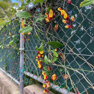 綺麗✨ フェンス沿いに咲くマイソルヤハズカズラ もう花は終盤? 少しですが花の房がまだあるので剪定出来ずフェンス沿いはモッサモサ🌿🌿❤️💛❤️🌿🌿