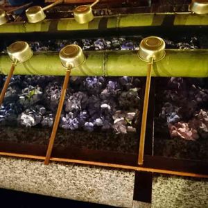川越氷川神社の「縁むすび風鈴」期間限定のご朱印符✨ 緑の画像とコラージュしました(^^) ご朱印帳に貼り付けるタイプで、色とりどりの風鈴🎐が描かれていてとても可愛いです♡ この期間、3回にわたって頒布される縁むすび風鈴限定お守り✨ その都度、違った絵柄が4〜5種類づつ頒布されるため、どの種類も可愛いくて全部欲しくなってしまう😅 友達にあげても喜ばれます(^^) 江戸風鈴に見立てた丸い水は、境内で数量限定で販売されるもので、1本300円と少々お高めですが、買い求める人の長蛇の列でした💦 可愛いので、しばらく飾っておきます🎐 どこかのカフェのポップアップストアが境内に☕️ 後ろに見えるオレンジの柱、木製では国内随一の大鳥居の柱です✨ 高さ15メートル、笠木幅20メートル、柱周3.45メートルだそうです⛩