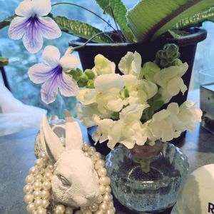 クリスタルアイス(プレクト…カーパスではなくて…植物名をド忘れ💦) と 水上がりが悪くなった白いストックを小さな瓶にIN✨ 室内の植物も動き出しました:;(∩´﹏`∩);: