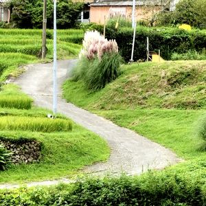 棚田の中 紫色のパンパスグラスと白いパンパスグラス 紫色のパンパスグラスを頂き、今日(9.11)のお月見に飾りました♡ 2022.8月に