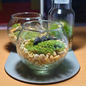 カプセルトイの苔テラリウム 今日届いたのでさっそく。 高さ約6cmのガラスボウル 軽石、ヤマゴケ、飾り石のセット アクアリウムのも買ったけど 種から育てるにはちょっと寒いかな? もう少し暖かくなったら開封するかな♪