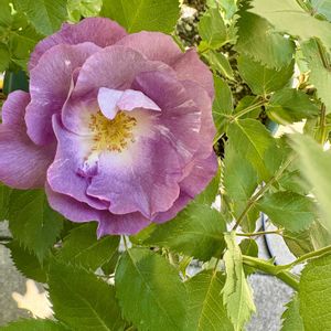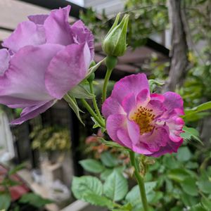 薔薇ブルーフォーユー 実家の庭です。これはもう10年以上前に新苗を購入したものでフロリバンダだからよく咲きますが、背丈は180センチ、横は1メートルほどと大きいです。とげがすごい。半日陰のほうが花色は美しいですね。1枚めは日当たりでローズピンクで咲いています。2枚めは咲き進んで青ざめた花。美しい〜