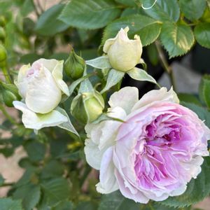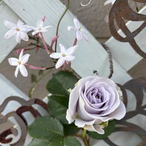 こんにちは😄 暖冬のせいか、我が家の秋バラは いまごろ開花の子がいます💦 ガブリエル様🤍💜開花しました🤍💜 すごーく細い枝にふんわり 咲いて、とても良い香りを漂わせています💜💜 色味はほぼホワイトですが、 気だるさそうな雰囲気は、カブ様らしいです😌