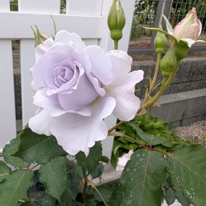 小林森治さんの〝思い出〟が初開花。 有名な青バラの〝青龍〟を作った方の品種です。 外側の花びらにうっすらグリーンがのり、薄いパープルのグラデーションが美しい上品なバラ。 まだ苗が小さめなので、早めにお花をカットします。